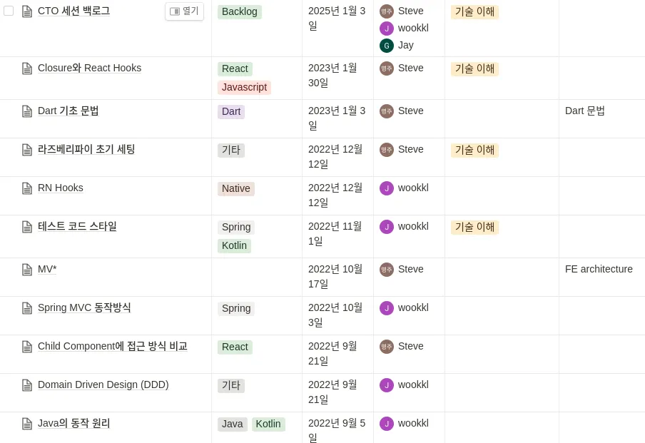 CTO 세션: 매주 개발 관련 지식을 팀원들과 공유합니다. 서로의 전문 분야를 이해하고 도움을 주기 위해 양보다는 자신과 듣는 사람의 이해에 집중해 운영합니다.