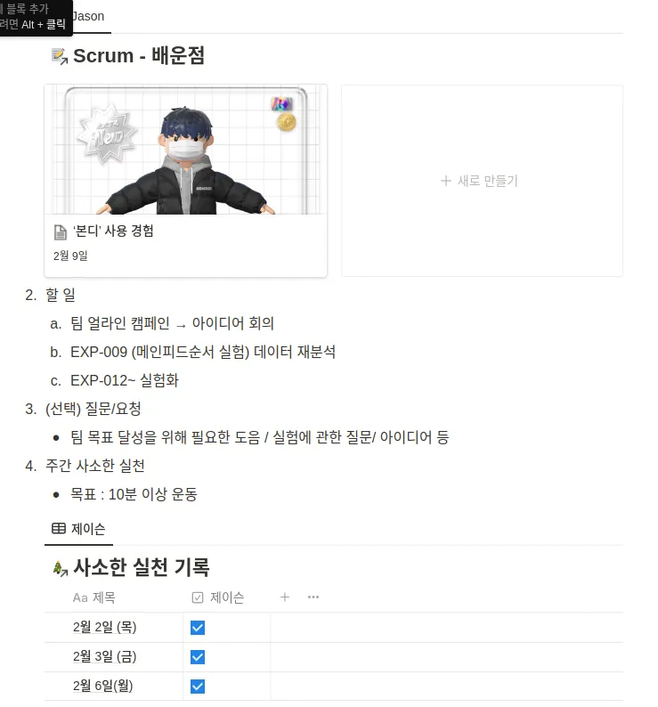 주간 사소한 실천: 한 주 혹은 스스로 정한 기간 동안 진행하는 사소한 실천입니다. 작은 일로부터 성취감을 느끼고 본인만의 루틴을 만들어 봅시다.